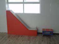 墙面装饰做出幅度不同的离心轨道斜坡,用球演示不同斜坡的离心力滚动情况。 |