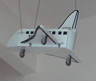 吊顶采用喷绘八大行星空图案,配以灯 光效果,行星为球体悬挂。 |